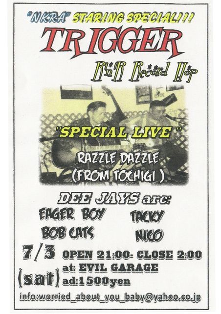 【TRIGGER】〜R'N'R RECORD HOP〜 7/3(sat) OPEN・・・21:00 CLOSE・・・2:00 AT:EVIL GARAGE(SHIMODATE) (住所:茨城県筑西市横塚119)←ラーメン屋・蘭蘭の看板が目印!!! AD:1500YEN(1DRINK) !!!!!NKRA STARING SPECIAL!!!!! 【SPECIAL LIVE】 RAZZLE DAZZLE(FROM TOCHIGI) 【DEE JAYS】 EAGER BOY・TACKY・BOB CATS・NICO 地図アドレス http://map.yahoo.co.jp/pl?lat=36.19.09.548&lon=140.0.45.982&p=%B0%F1%BE%EB%B8%A9%C3%DE%C0%BE%BB%D4%B2%A3%C4%CD%A3%B1%A3%B1%A3%B9&gov=08227.16