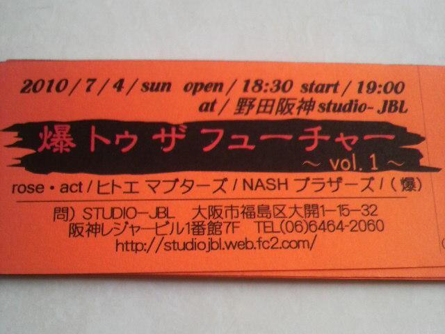 皆様、すっかり告知をこちらのほうでするのを忘れていましたノォォォォ では改めて2ndLIVEのお知らせです。 日記などでご来場のお名前は一応確認しておりますが、再度こちらのほうにも書き込みしてもらえるとうれちぃ♪にゃ 〜詳細〜 ■爆トゥザフューチャー 〜Vol、1〜 ■出演バンド Rose act. ヒトエマブターズ NASH ブラザーズ (爆) (Rose〜はオープニング19時予定) ■Open 18時半〜 ■Start 19時〜 StudioーJBL 大阪市福島区大開1−1