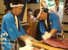 マグロとワインに酔うパーティー 『まぐろの解体ショー→食べる→呑む→酔う→happy♪』な感じのパーティーです マグロの解体資格のある方を招いての、日本刀による迫力あるショーを見て、 美味しいマグロを丸ごと食べましょう ・マグロのお刺身 ・中落ちで海苔巻き大会 ・兜焼き(焼けるか心配;) ・あら汁 ・マグロ皮の煮付けor茹でポン酢 ・その他 開催日時 2010年7月4日 日曜日 16時〜20時位まで。 場所 品川の高層マン