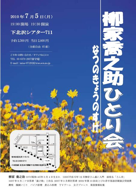 さーー 動き出すと早いんですよ〜 「オフィスねこにゃ」第二弾 喬之助師匠の独演会です。 4月上席の池袋演芸場でいいなぁと思ってしまっちゃったのですわーー 年に2回か3回くらいのペースで続けていけたらなぁと思っております。 今回はその第一回目。 何卒、何卒よろしくお願い申し上げます。 柳家喬之助ひとり会〜なつのきょうのすけ〜 日時:7月5日(月)19:00開場 19:30開演 場所:下北沢シアター711 料金:予約2,500円 当日2,800円(全席自由) ご予約・お問い合わせ/オフィスねこにゃ misa-071