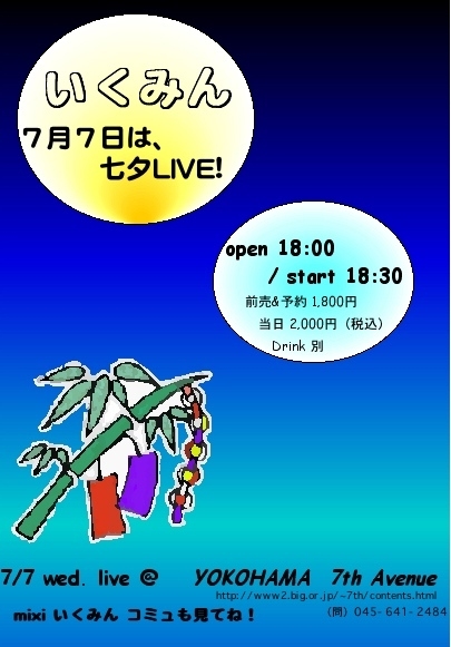 いくみん 七夕ライブ @ 7th Avenue 18:00 open / 18:30 start 前売&予約 1,800円/当日 2,000円(ドリンク別) いくみんの出演時間は18:30〜で、1番目です!