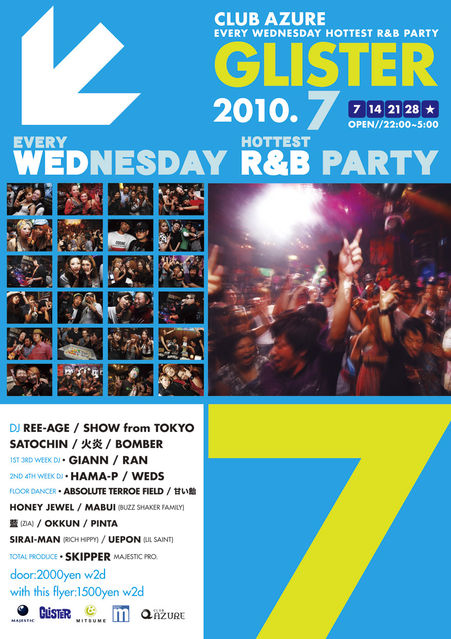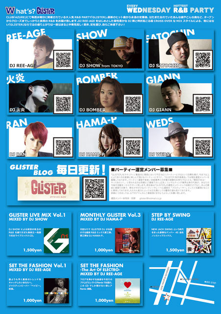 CLUB AZURE毎週水曜日の大人気PARTY『GLISTER』 R&B HIP HOPを中心にレゲエ、エレクトロMIX、最新のHIT曲から、定番曲まで 時には忘れかけてた名曲も DJ REE-AGEをはじめとした個性豊かなDJ陣が朝までフロアーを盛り上げます PARTYが大好き 音楽が大好き お酒が大好き そんな方にお勧めのイベントです 平日水曜日ですが、毎回満員でいい感じに盛り上がってます 是非一度AZURE水曜日GLISTERに遊びに来てみてください =========================mixi割引き情報======================== この告知をご覧の方はCL
