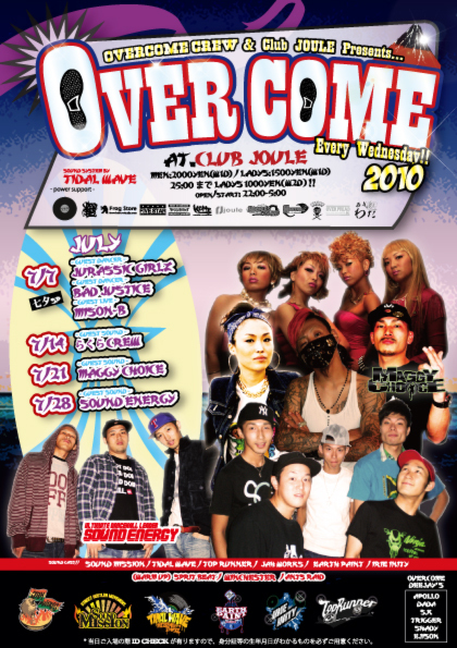2009年2月からスタートした!!NEW DANCE OVERCOME!! 大阪・関西を背負っていく若手SOUND、DEE JAYが集結! 毎週水曜日アメ村Club Jouleでスタート! !!!!!1時までLADIES FREE!!!!! 毎週水曜日CLUB jouleにぜひ遊べに来てください。 間違いなく楽しめる夜になります!! 皆さんのおかげで、一周年迎えることができました。 ありがとうございます。 2010年もOvercomeよろしくお願いします。 【 Overcome 】 @Club Joule OPEN 22:00 ~ CLOSE 5:00 MAN \2000(W/1D) LADYS \1500(W/1D) ※ 1:00まで女性入場無料!!!(