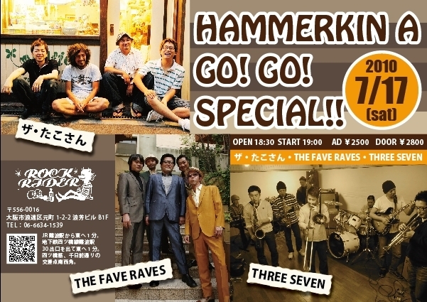 管理人様、失礼します。告知させて下さい。 7月17日(土曜日)大阪でThe Fave Ravesのライブです! 2010年7月17日(SAT) 「HAMMERKIN A GO! GO! SPECIAL!!」 @難波ROCK RIDER OPEN 18:30 START 19:00 AD \2500 DOOR \2800 THE FAVE RAVES/ザ・たこさん/THREE SEVEN 今回のHAMMERKIN A GO! GO!は強力メンツのスペシャルバージョン!東京よりキング オブ ソウルTHE FAVE RAVESが久々の来阪。地元大阪からはファンキーダイナマイト、ザ・たこさんが登場!京都からは関西を代表するオーセンティックスカバンドTHREE SEVENがや