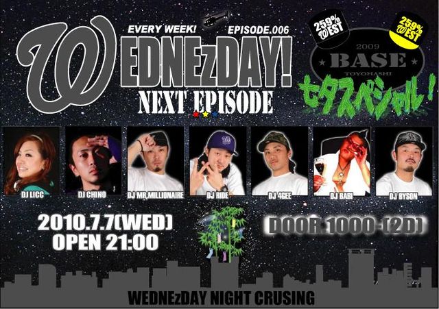 EPISODE−6−七夕スペシャル− 2010.7.7(WED) OPEN 21:00 DOOR.¥1000−(2Drink) 7DJz RIDE MR,MILLIONAIRE 4GEE BABI BYSON LICC CHINO 今回は!?七夕って事でWEDNEzDAY−スペシャルだよ! DJは7人w今月からWEDNEzDAY加入したLICC,CHINOも参加! 今回はスペシャルって事で〜! ¥1000−(2Drink)とスペシャルプライス! 平日なんて関係ないぜ!ス