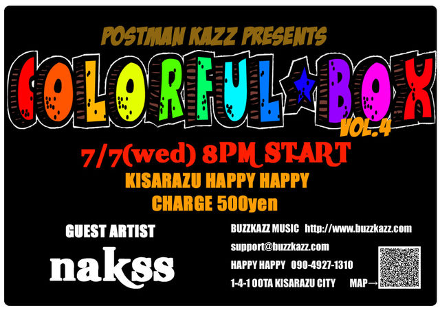 POSTMAN KAZZがホストを務めさせていただく企画も、ついに第4弾となりました! 今回は、POSTMANを初期の頃から知ってる方はご存知、千葉の路上で一緒に歌っていたナツコとの、七夕の夜に久しぶりの共演! 館山じゃず屋ニューマミーでのワンマンライブ以来かな? 現在はバンド『nakss(ナックス)』で活躍!メンバーを引き連れての木更津上陸です!! 7月7日(水) 20時スタート 千葉県木更津市ハッピーハッピー(木更津サイゼリヤ向かい側・ホテル八宝苑すぐそば) チャージ \500(別途1オーダーお願いします) 共演 nakss(ナックス)