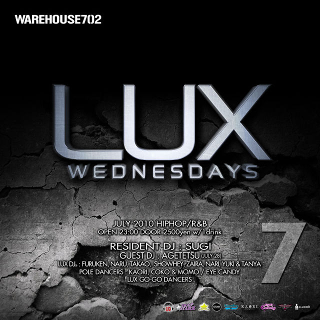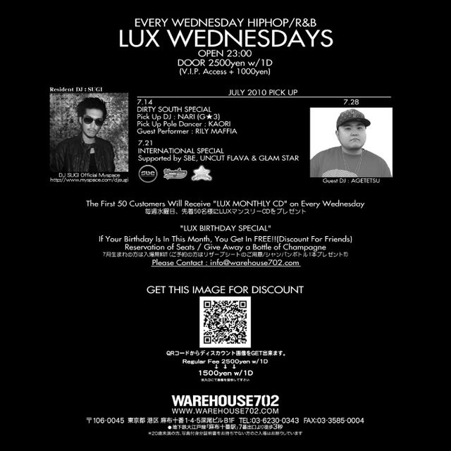 管理人様、告知失礼致します。 毎週水曜WAREHOUSE702で新たにSTARTしたHIP HOP/R&B PARTY "LUX WEDENESDAYS" 日本屈指のINTERNATIONAL DJとして注目されているDJ SUGIをRESIDENTに迎え、常駐するPOLE DANCER & GO-GO DANCERがワンランク上の空間を彩ります。 LUXでしか味わえない"LUXURY"かつ"INTERNATIONAL"な雰囲気をご堪能下さい! EVERY WEDNESDAY @ WAREHOUSE702 HIP HOP / R&B PARTY □■□ LUX WEDNESDAYS □■□ ◇ 7/7 (水) @ 麻布十番 Warehouse702 ◇ Open 23:00 ◇ Entrance Fee : 2500yen w/1D (V.I.P. Access +