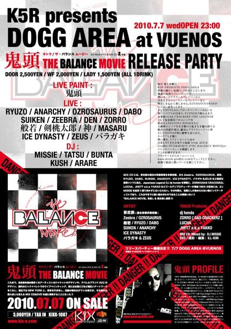 鬼頭 Graffiti DVD&MIXCD [THE BALANCE MOVIE] リリースパーティー 毎月 第1水曜日K5R PRESENTS DOGG AREA!! 皆様の暖かい応援で、5年目でございます。感謝の気持ちでいっぱいです。熱いオールドスクールフレイバーから今を生きるニュースクールフレイバーまで皆さんを心から楽しませる、DJやDANCEやRAPがいっぱい詰まってます。 まるでNYやLAの、ブロックパーティーみたいな熱いバイブスが日本で、VUENOSで味わえます。 妄走族・GAS CRACKERZ・THE LEGEND$ そして妄走族各ソロのジャケ写最近だとDELIやDJ HONDAなど大御所のジャケ