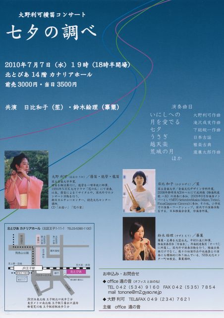 七夕の夜、日本の音を楽しんでみませんか。 北とぴあ、カナリアホールにてお待ちしております。 大野利可横笛コンサート 『七夕の調べ』 日時:2010年7月7日(水)19時開演(18時半開場) 場所:北とぴあ14階カナリアホール チケット:前売3000円/当日3500円 演目:いにしへの(大野利可:作曲) 月を愛でる(滝沢成実:作曲) 七夕 (下総皖一:作曲) うさぎ (日本古謡) 越天楽 (雅楽古典) 荒城の月 (滝廉太郎:作曲) ほか 出演:大野利可(篠笛、