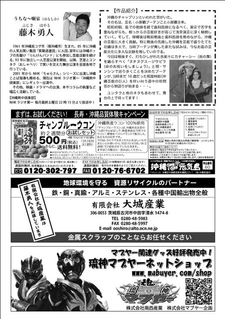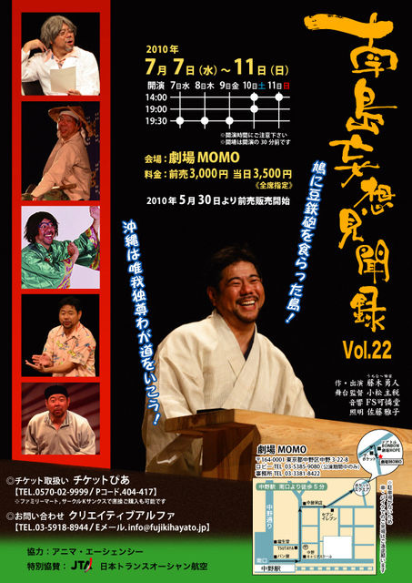 藤木勇人の事務所スタッフ、つばさです。 7月の南島妄想見聞録公演情報をホームページより、転記させていただきます。 先行予約をしていただいた皆様、ありがとうございました。 現在チケット発送準備中です。お手元に届くまで今しばらくお待ち願います。 一般発売は5/30からです。 ぜひぜひご来場下さいませ。お待ちしております。 *********** 毎年恒例の「南島妄想見聞録」、今年も中野にある劇場MOMOにて公演を行う事となりました。 今回のメインは沖縄のチャップリンといわれた男、小那覇ブーテンこと小那覇全孝の物語。