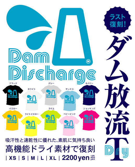 受付終了です 2010/7/09(金)23:59締切でした。 ---以下はオファー受付時の告知です--- 【ダムT】ドライで最終復刻 ダム行けば サイレン鳴る鳴る 放流時 昨年リリースさせていただいた 【ダム放流Tシャツ】を 要望の多かった吸汗&速乾/ドライ素材にて 最終復刻させていただきます。 もし狙ってたよ!という方いらっしゃればどうぞ これがラスト復刻となりますので (工場が版を廃棄してしまうため) お見逃しなき様お願いします。 Color*10 ブラック/ホワイト/グレー/サックス/ネイビー イエロー/ライトイエロー/ラ