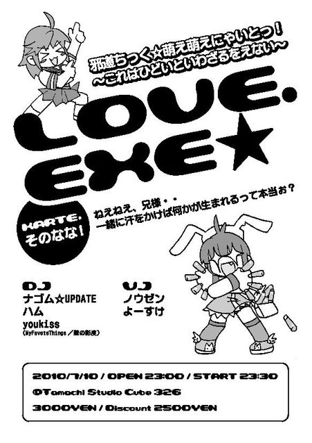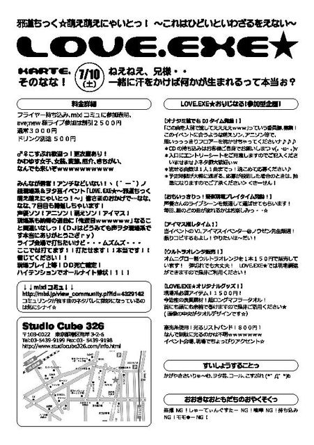LOVE.EXE★ 邪道ちっく☆萌え萌えにゃいとっ! 〜これはひどいといわざるをえない〜 KARTE.そのなな! ねえねえ、兄様・・ 一緒に汗をかけば何かが生まれるって本当ぉ? DJ ナゴム☆UPDATE ハム youkiss(MyFavoteThings/壁の彩度) VJ ノウゼン 2010/7/10 OPEN23:00 START23:30〜 田町StudioCube326 〒108-0022 東京都港区海岸3-2-6 Tel:03-5439-9199 Fax:03- 5439-9198 http://www.studiocube326.com/info.html 通常3000YEN フライヤ