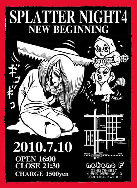 スプラッターナイト、vol.4開催決定! ★SPLATTER NIGHT 4 NEW BEGINNING★ 2010.07.10 Start16:30 Close21:30 会場:nakano-f 03-6276-3917 中野区中野5-46-10 J'sコート1F&2F(入口1F) ☆参加費 1500円 参加費支払後は、出入り自由です。 入場の際に、特典缶バッジをお渡ししますので、それがパス代わりになります! フード販売有りますが、ドリンクは各自持参でお願い致します!(冷蔵庫完備) ★展示&販売 ゾンビグッズ工房『binZo』 http://ameblo.jp/silicone-rubber/ 【お願い】 このイベントは営利目的ではありません。 参加費の150