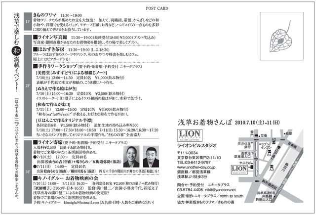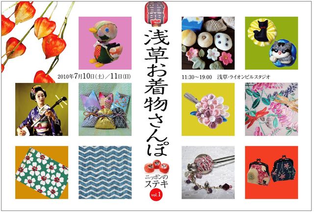 ニッポンのステキ vol.1 「浅草お着物さんぽ」 2010年7月10日(土)/11日(日) 11:30〜19:00 浅草・ライオンビルスタジオ http://www.another-day.co.jp/lion/interior/index.html “着物で浅草をお散歩”がテーマの、“和”スタイルのお楽しみ満載イベント。 四万六千日の「ほおずき市」でにぎわう浅草に遊びにきませんか。 <1階> ■ きものフリマ 11:30〜19:00 着物フリークたちが集めたお宝を大放出! 加えて、羽織紐、帯留、かんざしなどの和小物や、 洋服でも使えるバッグやモチーフ石鹸、お香な
