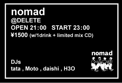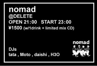 告知失礼いたします nomad 2010 . 7 . 10 ( sat ) PLACE : @ DELETE TICKET : 1500YEN( w/1drink ) OPEN /21 : 00 START /23:00 DEEJAYS nomad Crew techoパーティーです よろしくお願いします。