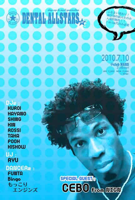 DENTAL ALLSTARS Vol.5 2010/07/10 (SAT) START 21:00 at MARS 前売り2000円ワンドリンク付き 当日 3000円ワンドリンク付き 今年で5回目となるDENTAL ALLSTARS!今回はニューヨーク、日本、韓国を始めとする世界各国のハウスダンスバトルで優勝の実績を誇るCEBOをSPECIAL GUESTに迎え、さらにはTokyo MidtownよりDJ KUROIが凱旋帰岡!!そして例年の如くHIPHOP,R&B,REGGAEからTECHNO,HOUSE,ELECTROまで様々なジャンルのresidentDJ、DANCERがフロアを盛り上げる!7月10日だよ!全員集合! ★★お立ち台ダンサー、振る舞い酒