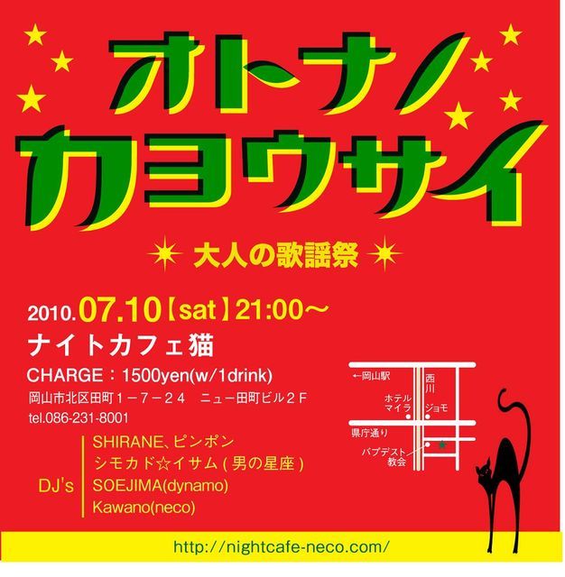 大人の歌謡祭#2 2010.07.10 sat 21:00〜25:00 @ナイトカフェ猫 CHARGE:1500yen(w/1drink) DJ Kawano(neco) シモカド☆イサム(男の星座) SOEJIMA(dynamo) ピンポン(HoppersPoppers) SHIRANE(HoppersPoppers)