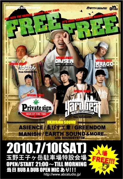 管理人様、レゲエイベント告知させて頂きます。 今日から7月スタート! 野外の季節到来!!!!(笑) 皆さんお外で遊びましょ〜 レゲエ好きは絶対チェ〜〜ック!! その名は【FREE FREE】 そうです!入場料タダです!! しかも、今月は横浜や大阪からGUESTもやってきます! respect&mannerを忘れずにがっちり遊びましょう !!! EARTH SOUND presents 『FREE FREE』 7/10 土曜日 入場料:FREE 場所:王子ヶ岳駐車場(玉野市) OPEN/START 21: