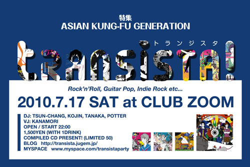 告知失礼します。 福岡のロックDJイベント“Transista!”(トランジスタ)です。 ■ブログ http://transista.jugem.jp/ ■myspace http://www.myspace.com/transistaparty ■mixiコミュニティ http://mixi.jp/view_community.pl?id=4256518 --------------------------------------------------------------------------- 今回の"Transista!"は6/23に待望のニューアルバム『マジックディスク』をリリースし、今や日本のロックシーンの中心的存在ともいえるASIAN KUNG-FU GENERATIONを特集します! アジカンのデビューから現在にいたる