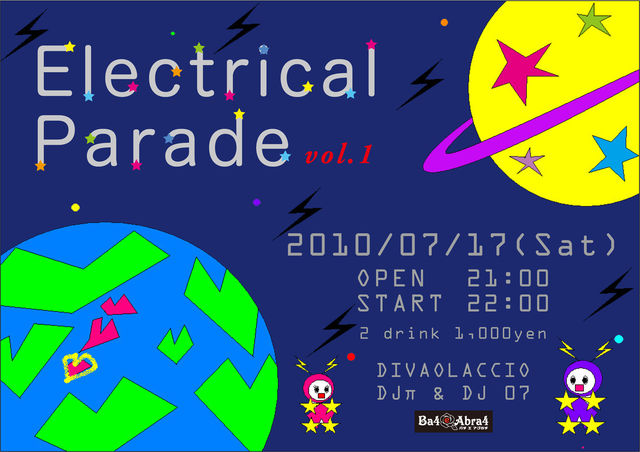 ELECTRICAL★PARADE 〜エレクトリカルパレード〜 Vol.1 ★2010/07/17 (土) ★Open 21:00〜 Start 22:00〜 Crose 26:00 ★at “Ba4 e Abra4” (井尻六つ角から徒歩1分) ★DJ “DIAVOLACCIO” DJ π DJ 07 22:00〜 07 23:00〜 π 24:00〜 07 24:45〜 π 25:30〜 DIAVOLACCIO さてさて ヤッテマイリマシタ 久々の“ヨツウチ”イベント その名も〜 『エレクトリカルパレード』 楽しそうでしょ 楽しいで