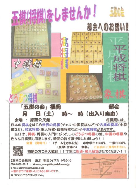 今回の目的 今回は、将棋・五棋教室という形ではなく、五棋の会の原点に立ち返って、五棋を色々な方に知ってもおうとのコンセプトで開催します 将棋をはじめ、五棋の資料をイロイロと用意していますので、是非みなさま口コミをよろしくお願いします(笑) 実際にゲームもしましょう ================ 将棋、中将棋、平成将棋 チェス、象棋、韓国象棋 どうぶつ将棋、京都将棋 …、他イロイロ ================ □ 将棋日和? : 世界の将棋部会 イロイロと知ってもらい