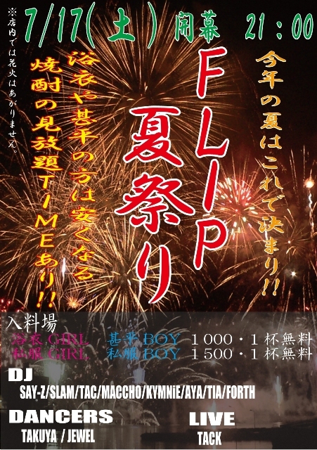 Blazing pro × CAVE × RED RIBON Presents 『Blazing Saturday』 〜Summer Special〜 2010年 07月17日 (土曜日) @club CAVE (鹿児島 天文館) ADV : \2.000- / 1Drink order DAY : \3.000- / 1Drink order OPEN : 22:00 〜 ◇SPECIAL GUEST ARTIST◇ MISON-B fr 大阪 ◇SPECIAL GUEST SOUND◇ FIRE WORKS fr 大阪 RISKY DICE fr 大阪 ■Good Muzik■ BLACK SNIPER カンニバル RAS fr Buck Wild FRONT LINE ●DEEJAY / SINGER ● ヒロポン てけれぇ TATTSUNN ○FLOOR DANCER○ D.K. □Early Worm□ ONE'S HOME ※HOST※ BURNING BLAST 今
