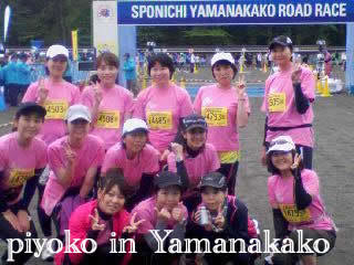 おひさしぶりで〜す 昨年、こちらのコミュで初心者ランナーのために発足したぴよこ隊です 早いもので発足からもう1年半が経ちました。 おかげさまで今現在も1カ月もしくは2カ月に1回の皇居を中心とした練習会と 大会参加を楽しくほのぼのと行っています。 先日は山中湖ロードレースに合宿と称してペンションに前泊して皆で参加、 ハーフマラソン全員完走してきました お揃いのチームシャツを着た仲間と一緒に走ったレースは めちゃくちゃ楽しかったです で、大会も終わったところで久々の練習