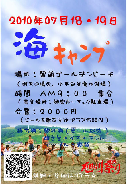 皆様、おいっすー やってまいりました ☆旭川祭り☆一大イベント 海キャンプ ひにち 2010年07月18・19日 時間 集合 9:00 (集合場所:神楽ホーマック駐車場) 出発 9:30 {go!go! ※車はなるべく乗り合わせて 来てもらえると助かります 会費 2000円 (ビール飲む方はプラス1500円) 持ち物 <全員> 飲み物(ビール以外) <持ってる方> 焼き台 椅子 テント テー