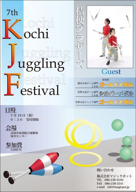 どうもみなさんお久しぶりです&はじめまして、ほったらかしの管理人・どんです。 イベントがあるみたいなので宣伝させていただきます。 早いもので高知ジャグリングフェスティバルが7回目の開催となりました。 このまま10回20回とできていったらいいなぁっと思ってますます。 では詳細を。 第7回高知ジャグリングフェスティバル (以下第7回KJF) 2010年7月19日(月・祝) 会場:東部総合運動場内 体育センター (前回と同じ会場) 088-878-1150 高知市五台山1736-1 ゲスト:桔梗ブラザーズ 参加費:5000円