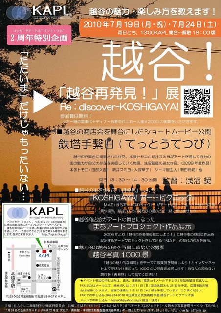 皆様 美P2006年度卒業生です。 今回越谷をテーマにしたアート企画をやりますのでお知らせいたします。 KAPL2010年7月の展覧会企画です。 2010年7月でKAPL(コシガヤアートポイント.ラボ)は2周年を迎えます。 今回、アートを通して見えてきた「越谷」の魅力を再発見できる企画です。 越谷市で撮影され、アートで地域商店主さんとの暖かい関わりを描いた映画「鉄塔手繋日」や、アートで生まれた人と人との繋がりを実感できる「越谷アートピクニック」、越谷の魅力ある写真を公募した「越谷写真1000景」な