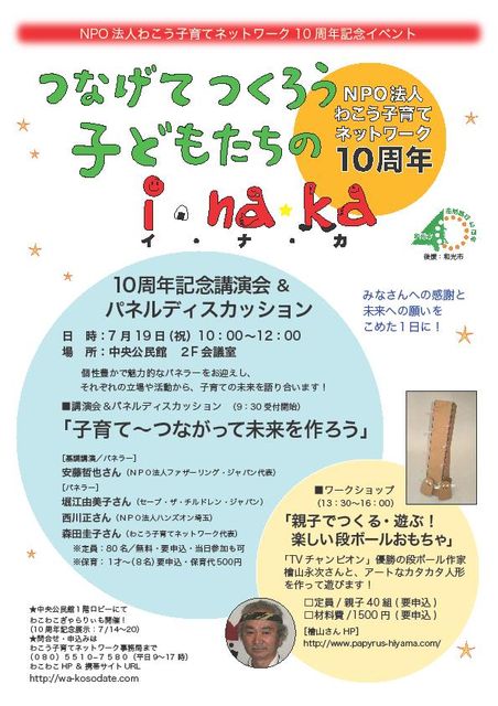 この週末3連休の最終日、わこう子育てネットワーク(わこわこネット)設立10周年記念事業として、シンポジウムとワークショップが下記のように開催されます。 もし3連休にお出かけのご予定がなければ、ぜひおいでください。 また、7月14日〜20日の間、中央公民館1Fロビーでは、わこわこネットのこの10年の活動を紹介した記念展示<わこわこぎゃらりぃ>も開催中ですので、こちらも合わせてぜひご覧ください。 子育て中のママ&パパ、ご参加をお待ちしております〜。 【第1部】記念講演会&パネルディスカッション 日時:7月19日(月・祝)10