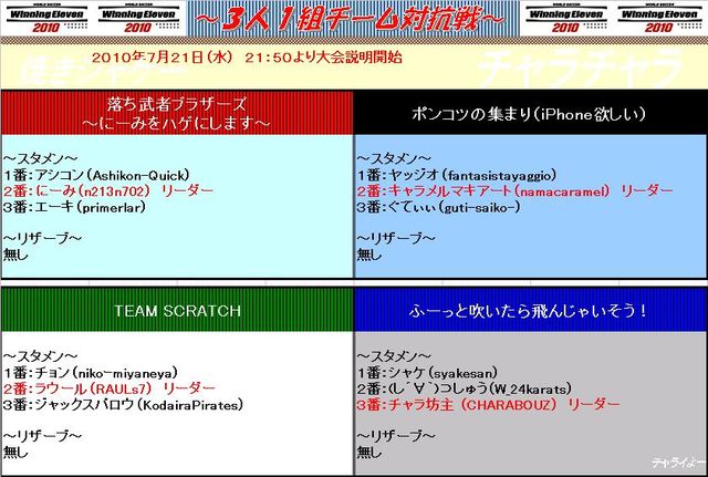今大会は大会の進行や形式が今までの大会と全く 異なりますので、必ず規定を確認の上、参加表明お願いします。 チームはアシコンが勝手に振り分けますので、どんどん皆さん参加 してください。 必ず最新版のパッチをアップデートした状態で 大会に臨んでください。 参加希望者は「イベントに参加する」を選択し、ウイイレID(PS3ID) を記載してください。IDの記載がない場合、参加と見なしません。 大会当日運営はロビーチャットにて行ないますので、ロビーにいるときは ロビーチャットを確認出来る画面状態にしてください。 アシコ