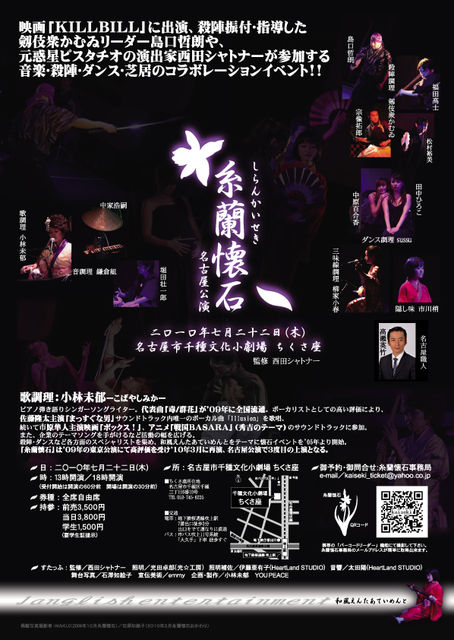 「糸蘭懐石〜名古屋公演〜」 日:七月二十二日(木) 時:開演十三時〜、十八時〜(開場は各三〇分前) 持:前売/三五〇〇円 当日/三八〇〇円 学割/一五〇〇円…学生証をご提示下さい。 所:名古屋市千種文化小劇場 ちくさ座 出演:歌調理/小林未郁 殺陣調理/剱伎衆かむゐ…島口哲朗、福田高士、宗像拓郎、松村裕美、鈴江柚衣 G-Rockets…小林由佳 ダンス調理/sussu…田中ひろこ、中原百合香 三味線調理/柳家小春 音調理/鎌倉組…中家浩嗣、堀田壮一郎、小林未郁 隠し