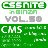 次のCMSを取り上げます ・a-blog cms(機能追加のご紹介など) ・Jimdo(Pro版が追加され、最近話題になることが多い) ・tsumiki2.0 http://cssnite.jp/ginza/vol50/ -------------------------------------------------- ・「mixiでの参加表明」(=仮)と「事前登録」(=正式)は異なります。 ・mixiで参加表明いただいた方には、事前登録を、少し早めにご案内いたします。 ・確実にご入場されたい方は、mixiにて参加表明の上、 忘れずに事前登録をお願いします。 ・参加表明は6月末日で締め切ります。 とりあえず、表明して