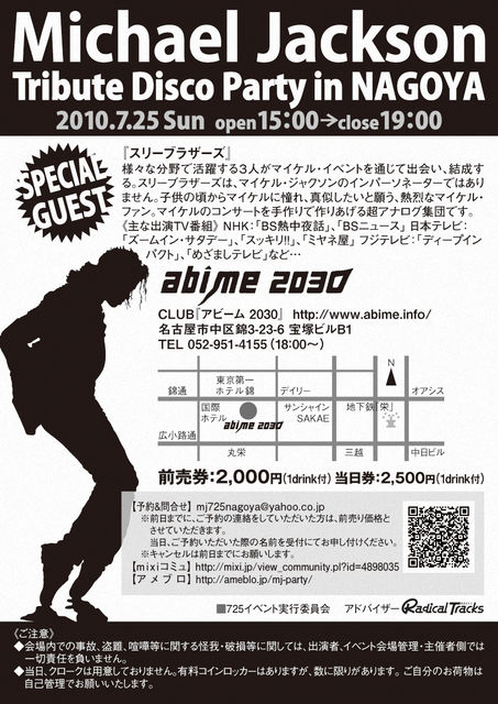 ついに… あの… あの… あの「スリーブラザーズ」が名古屋にやってくる マイケルイさん、舞華留・李さん、マイケルやもさん全面協力の下、DJちゃっきぃとのコラボでクラブイベントが実現します 絶対に楽しくないわけがないっ そこのあなた(^_-)-☆ 是非とも参加ボタンぽちっとしてってね 【日程】7月25日(日) 【時間】15時〜19時 ※開場は15時を予定していますが、当日の状況次第では30分ほど入場を早める場合もございますのでご了承ください。 【場所】CLUB「アビーム