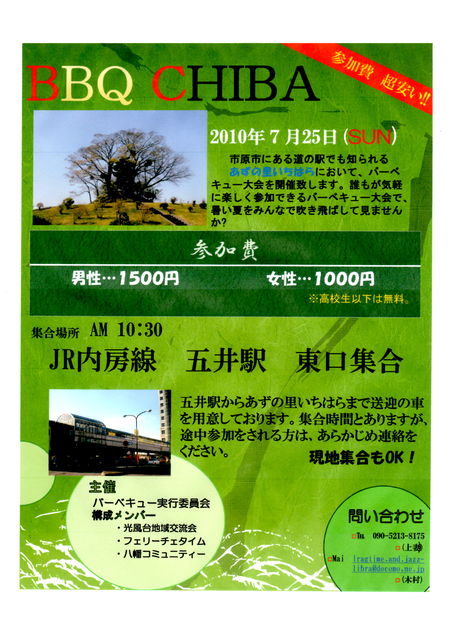 レディース アンド ジェントルメン さぁ今年の夏は、皆でバーベキューをしようじゃあ〜りませんか 参加費も実に安い 男性1500円、女性1000円そして、小、中、高校生は無料ときたもんだ 年代の垣根を越えて、たまには見知らぬ方との会話を楽しむのも緊張とともに良いもんですそして、いつのまにかお友達になるってもんです 集合場所は、午前10時30分に五井駅と早めではありますが、そこはスタッフ一同心をこめて、バスを借りています。でも、皆さんが来てくれないと、こっちも寂しいそこ
