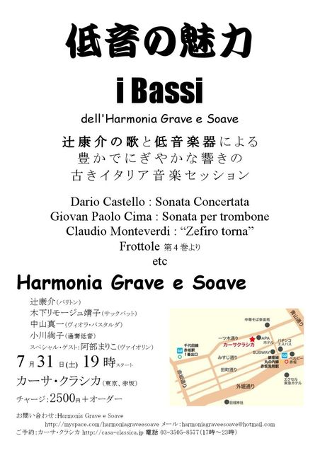 辻康介の歌と、サックバット、ヴィオラ・バスタルダの低音楽器が織り成す 想像を超えた豊かな響きの世界です! チャージ2500円+オーダー ♪モンテヴェルディやカレスターニの、おなじみのカンツォネッタ、 ♪Dario CastelloのソナタやFalconieroのカンツォン ♪フロットラの名曲の数々 などなど ☆辻康介(歌) ☆木下靖子&永田美樹(サックバット) ☆小川絢子(オルガン/チェンバロ) ☆阿部まりこ(ヴァイオリン) ☆中山真一(ヴィオラ・バスタルダ)