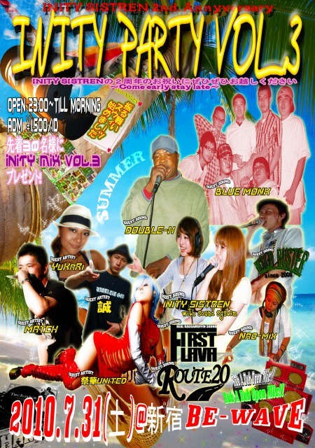 管理人様、告知失礼致します。 〜INITY SISTREN 2nd.Annyversary!!〜 『INITY PARTY』vol.3 2010・7・31(土) @新宿BE-WAVE http://www.myspace.com/initys1stren ★先着30名様にINITY MIX vol.3 プレゼント! ●GUEST SOUND ・DOUBLE-H fr jammers Record ・BLUE MONK ・FIRST FLAVA ・Nao-mix ・WILD BUSTER ・ROUTE20 ●GUEST ARTIST ・祭華united ・誠 ・YuKaRi ・MATCH & Rub A Dub Open Mic!! ●HOST SOUND ・INITY SISTREN with sound system http://mixi.jp/view
