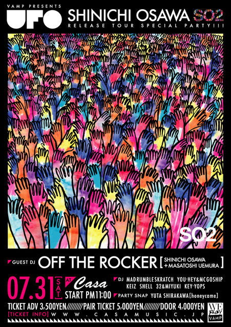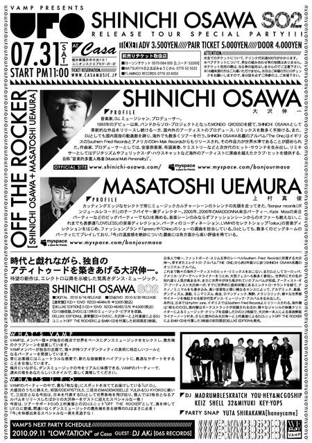 管理人様、告知失礼いたします。 ディスカウントご希望の方は、 [代表の方のカタカナフルネーム+お連れ様最大人数] を、メッセージしてください。 ご優待価格ご用意できます。 ※前売チケットが無くなり次第、終了いたします。 7/31 SAT VAMP presents - U.F.O 2010 - SHINICHI OSAWA "SO2" RELEASE PARTY in 福井 @ Casa MAIN DJ: OFF THE ROCKER (Shinichi Osawa + Masatoshi Uemura) DJ: MAD RUMBLE SKRATCH YOU-HEY & MC GOSHIP Keiz Shell 32 & MIYUK