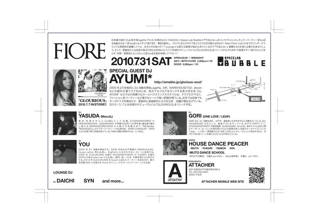 管理人様、告知失礼致します。 ☆7/31(土)Space Lab BUBBLEにてNew Partyが始まります☆ 日本最大級のClub新木場ageHAでもDJを務めるDJ YASUDAとSpace Lab Bubbleが『今迄にない』をコンセプトにしたレギュラーパーティー【Fiore】を始動させる!! 【Fiore】とはイタリア語で【花・華】を意味し、フロアにきらびやかで色とりどりの花を散りばめます! Main Floorにはこれまでのアンダーグラウンドな雰囲気を踏襲しつつも、まさかの仕掛けが!? Loungeにも新たな要素が組み込まれているので『今迄にない』華麗なものを感じる事が