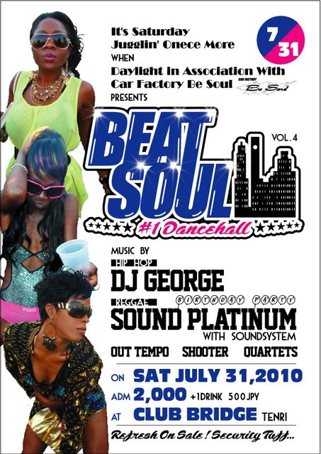 イベント告知失礼します。 日程 :7月31日(土) 場所 :CLUB BRIDGE (奈良県天理市) タイトル:BEAT SOUL 出演者 :★DJ GEORGE(HIP HOP) ★SOUND PLATINUM with SOUND SYSTEM(REGGAE)☆OUT TEMPO ☆SHOOTER ☆QUARTETS 料金 :2,000円 (入場時1D500円要) 今回のイベントは、REGGAEとHIP HOPを存分に楽しんでいただけるよう企画しました。REGGAEからは、SOUND PLATINUM! そして、HIP HOPからは、DJ GEORGEに来ていただき開催します。 なんと。。。 この日は、SOUND PLATINUMのサウンドシステムも設置! 極上