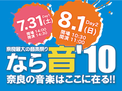 2010年07月31日(土) なら音'10 "仁丹女とホッピーブラザーズ "KIDS "Morita Gaadenn "SOUL BEAT "IN/OUT "平田祐也 "will-o'-the-wisp "APSEMARY "並行は白だった "ANDREW KITCHEN OPEN14:00/START14:30 前売\1500/当日\1800 お昼からネバランでお祭りです! 是非是非!! CDも持っていきます!