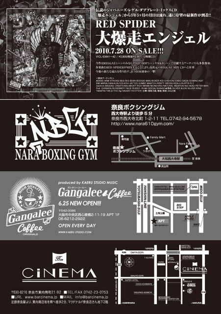 大和VIBES vol.2 7月31日(土) 奈良県奈良市 @Bar CINEMA (東向南町21 奈良観光会館B2F) TEL:0742-23-0753) OPEN 22:00 (出演) RED SPIDER/HAN-KUN/BES/SOUND ENERGY/SUN TOWN/DADA/寿君/ NAJIMI/KONG/AMAWREST-B/鹿女青によし SOUND SYSTEM by K-3756S 前売 3000円 当日 3500円 ※共にドリンク代別途500円必要です ■TICKET INFO■ ローソンチケット0570-084-005 (Lコード:54304) http://l-tike.com/d1/AA02G01F1.do?DBNID=1&ALCD=1&LCD=54304 FROG STORE 06-6211-2609 Greed 0742-26-8775 MACAMOCARI 0742-22-5744 Ba