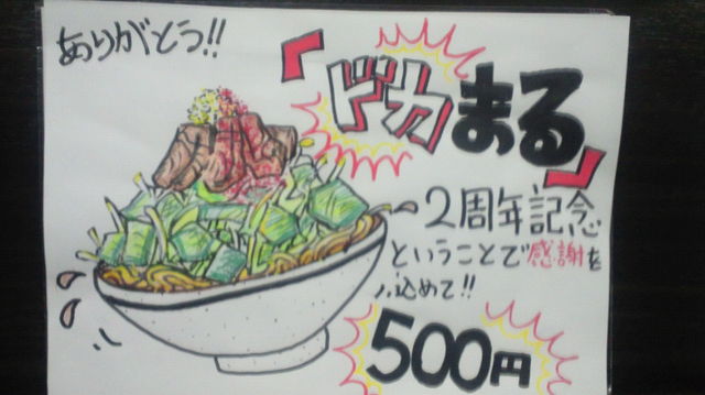 2010年8月1日(日) (はなびの日) 皆様のお陰で無事2周年を 迎えさせて頂く事ができます 2周年の記念としまして 皆様への感謝を込めて 限定メニューを 提供させて頂きます 今回の限定は 二郎系インスパイア 『ドカまる』 に決りました なんと ワンコイン 『 5 0 0 円 』 で提供させて頂きます