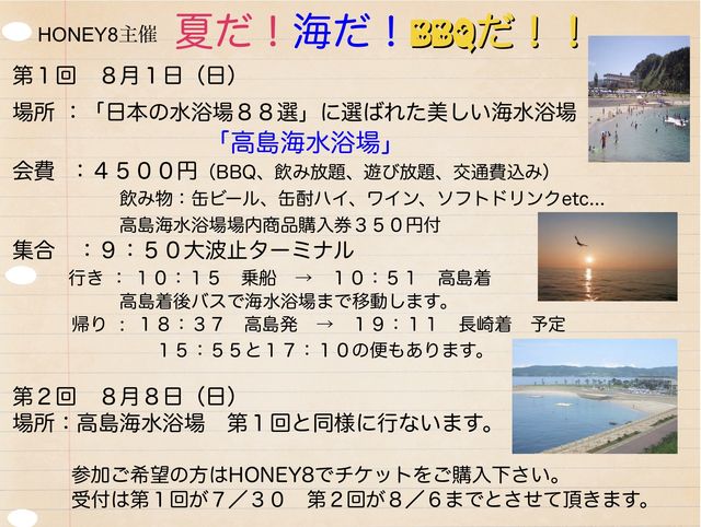7月11日に予定してたBBQが悪天候のため中止となったり、そのリベンジとしてまた企画しちゃいました。 第1回 8月1日(日) 場所 :「日本の水浴場88選」に選ばれた美しい海水浴場 「高島海水浴場」 会費 :4500円(BBQ、飲み放題、遊び放題、交通費込み) 飲み物:缶ビール、缶酎ハイ、ワイン、ソフトドリンクetc... 高島海水浴場場内商品購入券350円付 集合 :9:50大波止ターミナル 行き : 10:15 乗船 → 10:51 高島着 高島着後バスで海水