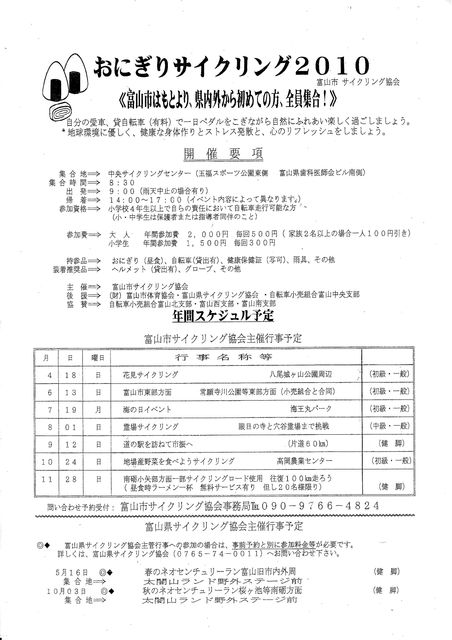 富山市サイクリング協会主催のサイクリングイベントの紹介です。 おにぎりサイクリング2010 8/1日曜 霊場サイクリング 眼目の寺と穴谷霊場までサイクリングイベントが有ります。 (中級・一般) 前回の海王丸パークまでのサイクリングは20名程の参加者がいました。 (中央サイクリングセンターの管理人者談) 詳細は添付画像見て下さい。 とりあえず私は 8/1と9/12は参加予定です。