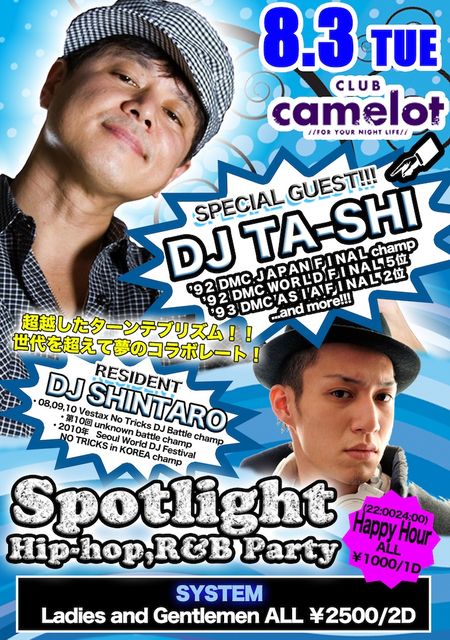 管理人様告知失礼します。 2010-08-03 (火) Spotlight『HIPHOP,R&B PARTY』@club camelot SYSTEM ¥2500/2d HAPPY HOUR 22:00〜0:00(MEN&WOMEN ¥1000/1d) SPECIAL GUEST DJ TA-SHI DJ TAKUMA / SHINTARO / SHUNSUKE / TOMOHARU / SAORI / MIU-G / YUSA キャメロットのレジデントDJ TAKUMAを筆頭に毎週火曜日かなりの盛り上がりを見せる 『SPOTLIGHT』 第一週目は4月からメインフロアに移動し平日にもかかわらず400名の動員を記録 5月のゴールデンウィークはhousenationとの合同パーティーで1600人以上の動員