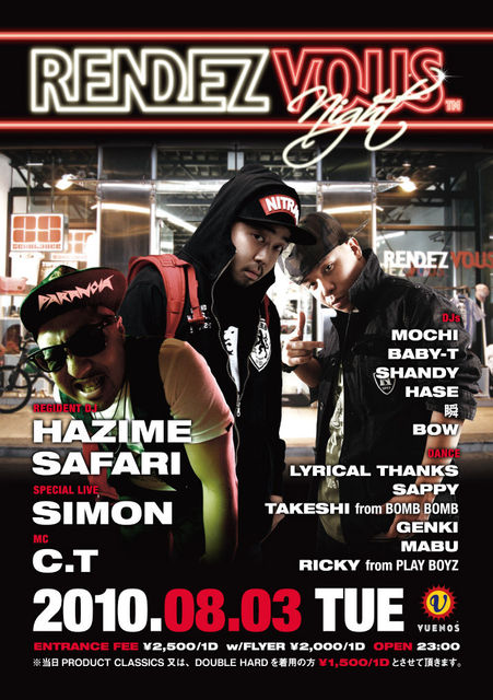 8月3日、火曜日! 渋谷VUENOSにて行われるスペシャルパーティー『RENDEZVOUS NIGHT』のお知らせですが、 諸事情のためむかいのエイジアでの開催になります!!! 原宿のショップ、RENDEZVOUSとコラボレーションしたこのイベント! レジデントにはDOUBLE HARDのプロデューサーとしても知られる、 DJ HAZIME! そしてDJ SAFARI! スペシャルライブにはSIMONが登場!! さらにMCにはC.T! ダンサー陣も超豪華な内容となっています! このスペシャルイベント!通常2500円かかってしまうところ、 僕にメッセージ頂ければ、 特別