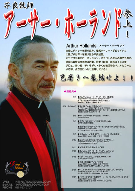 8/3(火) ◆カムオンHALL 「アーサーホーランド講演会」 チケット1000円open19:00 start19:30 札幌市豊平区中ノ島2条1丁目3番25号 カムオンビル (地下鉄:南北線 中の島駅から徒歩一分 一番出口) Tel:011-833-6664 8/4(水) ◆ラジオカロス札幌 ラジオのお仕