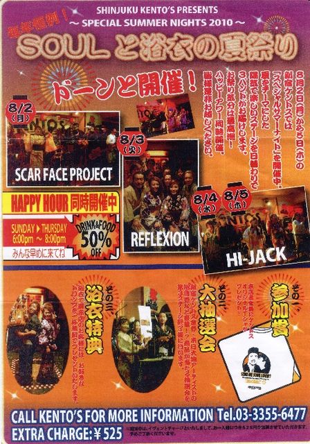 【ソウルと浴衣の夏祭り】 ■日 時 8月5日(木)19:00〜 ■場 所 新宿ケントス http://www.kentos-tokyo.jp/shinjuku/ ■バンド ハイジャック http://www.hi-jack.jp/ ■浴衣で来店した人にはドリンク一杯プレゼント (浴衣ってなかなか着る機会もないので是非浴衣着用してみてね) http://www.kentos-tokyo.jp/shinjuku/event/ ■賞品が当たる大抽選会あります。(第三ステージ終了後22:00頃) (昨年はBryan隊長が賞品ゲットしました −賞品何だったんだろ?) ■料金